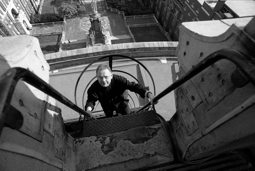 Oops, how did that photo creep in here? It’s Robert climbing to the top of the building, back when we last played here… in 1995!