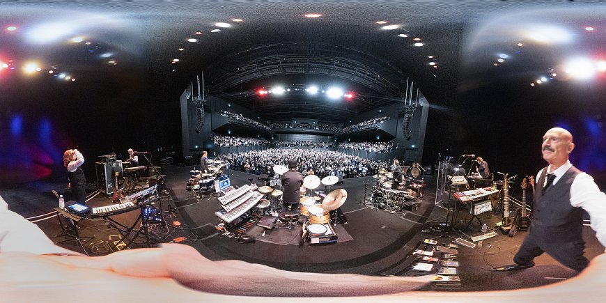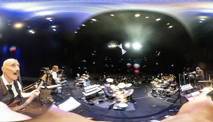 Well, tonight I tried it, just a quick snap with the 360 panoramic camera. But… something else happened that was also a first. For a long time I’ve asked Jeremy if he might consider tossing his stick toward me, so that, hopefully, I might catch his drumstick and finish out the piece playing a la funk fingers, with that stick in my hand. How cool would that be.