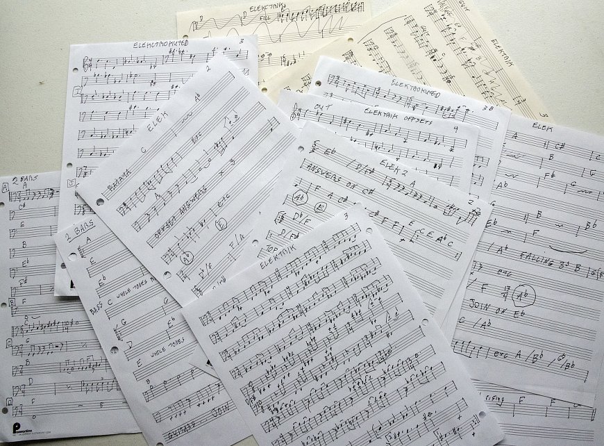 One of the things that makes rehearsals so necessary for us is the complexity of the music. There’s one piece, for example, named Elektrik, where I’d long ago made charts of the great part Trey Gunn had played on the original. Needed to write out every note to grasp and practice it. But the chart was much too long, so as I learned it, I would substitute section names, like “Ratata” or “Offset answers”. Well, months ago, when I sat down to practice it at home, I realized I didn’t remember what those section names meant, and I’d lost most of the original written out parts… but I did have many mid-way charts. Just for fun, I took a picture at home of most of the pages I’ve come up with for that one piece.